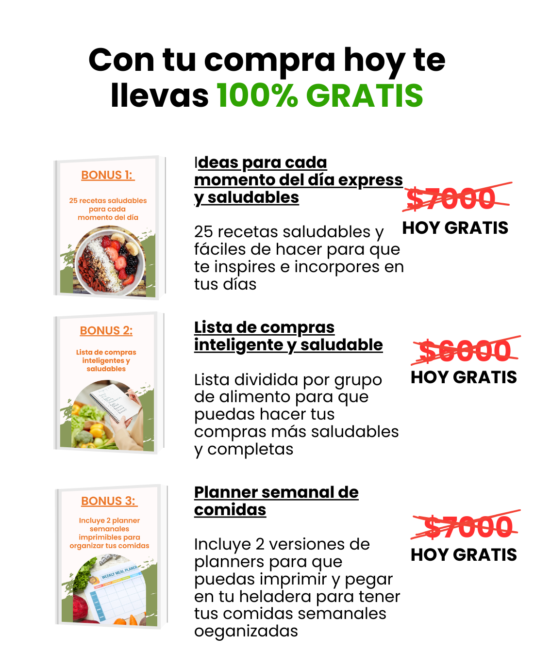 Sí, en los bonos tenés ideas expresas listas para usar, además de consejos prácticos para resolver tus comidas sin complicaciones.