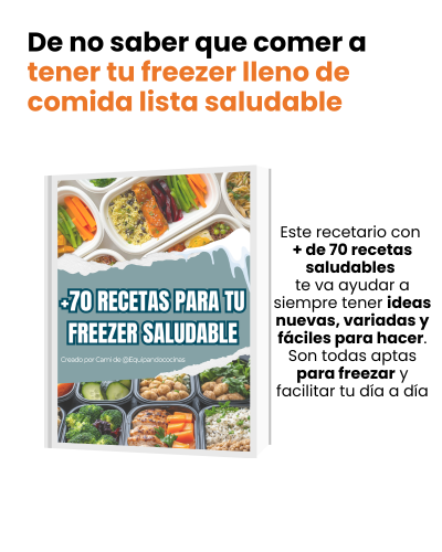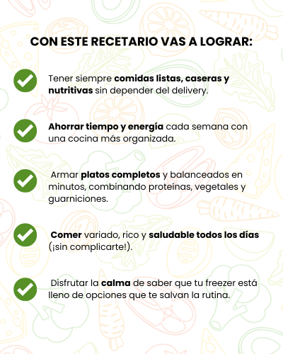 El recetario incluye + de 70 recetas completas saludables aptas para freezar divididas por alimentos: